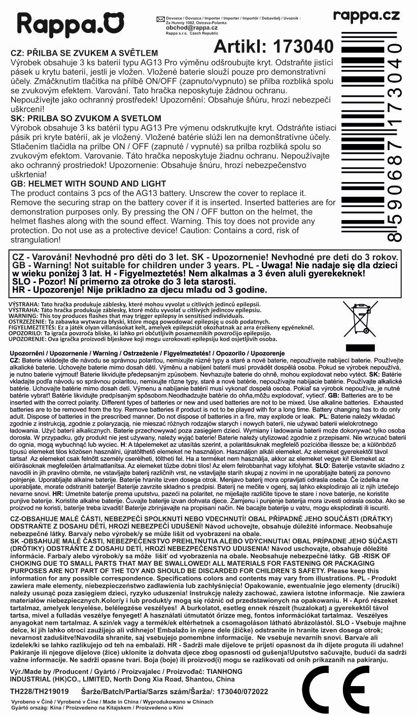 Praktická helma s ochranným krytem pro malé policisty! Tento kvalitní kousek je vyroben z plastu a zdoben odznakem na přední straně. Navíc při stisknutí tlačítka helma bliká a hraje. Velikost helmy si můžeš nastavit podle vlastní hlavy! Tak zažij opravdickou záchrannou akci. Součástí balení jsou 3 ks baterií typu AG13.