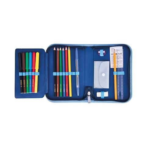 Holky a kluci 20,5 x 14 x 3,8 cm, 19 ks psacích potřeb dílů 6 fixí, 6 pastelek, 1 tužka, 1 pero, 1 ořezávátko, 1 guma, 1 pravítko, materiál polyester, Mořský koník, kůň, kosmonaut, fotbal