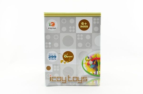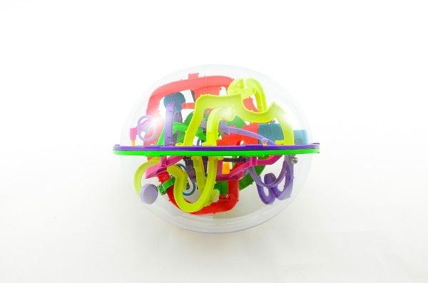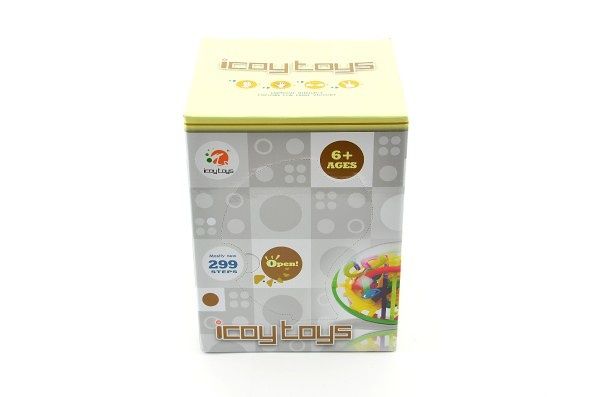 Plastová transparentní koule, která obepíná soustavu berevných překážek pro kuličku, která by měla zdolat trasu z bodu 1 až po pozici 299.