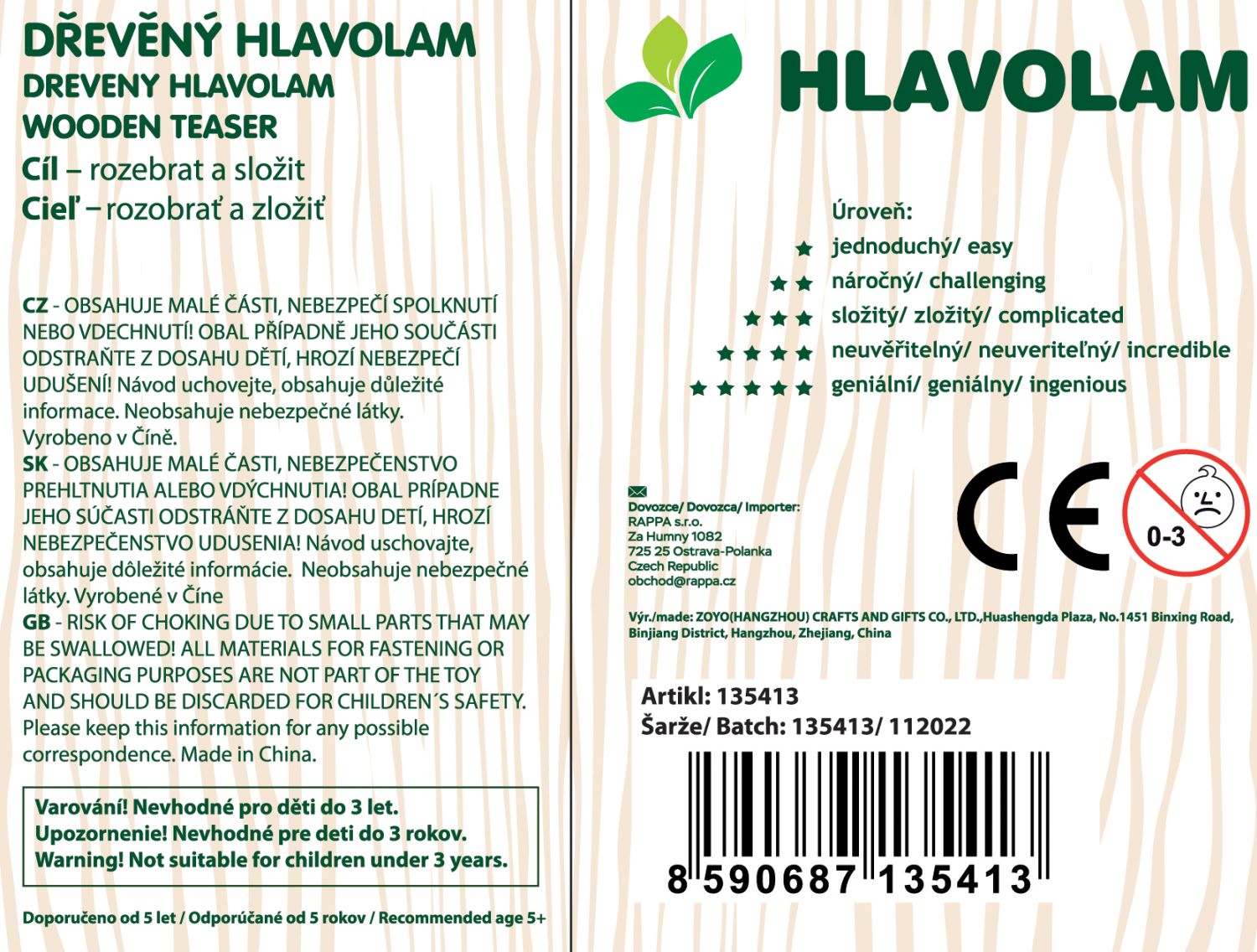 Stylový hlavolam vyroben z kvalitního dřeva je určen pro všechny, kteří si chtějí procvičit paměť! Tento parádní kousek nabízíme v osmi variantách. Hlavolam je navíc zabalen do dárkové krabičky! Můžeš si vybrat také stupeň náročnosti od 1 do 5. S touto chytrou hračkou se zaručeně nebudeš nudit!