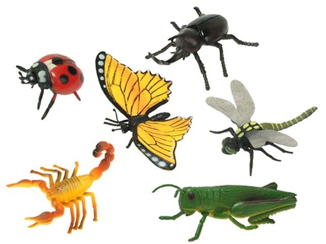 Druhy: motýl, vážka, beruška, kobylka, štír, nosorožík