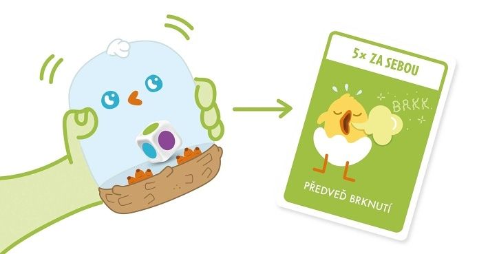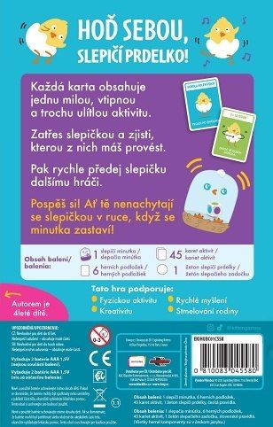Hoď sebou, slepičí prdelko je Koťátková hra od tvůrců Výbušných koťátek. Tato hra společně s dalšími Koťátkovými hrami vám garantuje skvělou zábavu i s těmi nejmenšími. Za jejím vznikem stojí čtyřletá holčička, která společně se svým tatínkem (Elan Lee - autor Výbušných koťátek) vzala papíry, fixy a nálepky a pustila se do vytváření her, u kterých se budete bavit a zároveň se i něco naučíte.O čem tato ztřeštěná slepičí hra je?Každá karta obsahuje jednu milou, vtipnou a trochu ulítlou aktivitu. Zatřeste slepičkou a zjistěte, kterou z nich máte provést. Po úspěšném provedení aktivity rychle předejte slepičku dalšímu hráči. Pospěšte si! Ať vás nenachytají se slepičkou v ruce, když se minutka zastaví!Co je cílem hry?Co nejrychleji plnit bláznivé aktivity a nenechat se nachytat při držení slepičky, když se minutka zastaví - tahle hra dostane do varu jak děti, tak i rodiče.Tato hra podporuje: fyzickou aktivitu, kreativitu, rychlé myšlení a rodinného ducha. Upozornění: Hra vyžaduje 2 baterie AAA 1,5V, které nejsou součástí balení.Obsah balení:1 slepičí minutka45 karet aktivit6 herních podložek1 žeton slepičí prdelky1 česká a slovenská pravidla