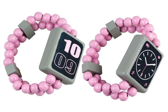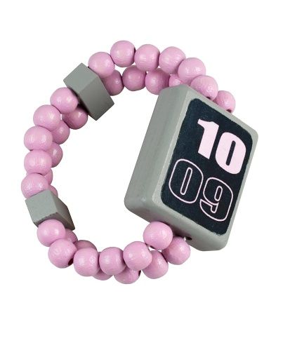 Oboustranné dřevěné hodinky s obrázkem digitálních a ručičkových hodin. Navlečeno na gumičce.