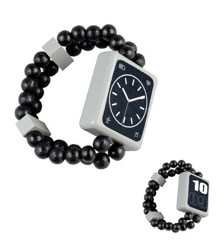 Oboustranné dřevěné hodinky s obrázkem digitálních a ručičkových hodin. Navlečeno na gumičce. Výrobek splňuje požadavky EU na bezpečnost hraček a je vhodný pro děti od 3 let.