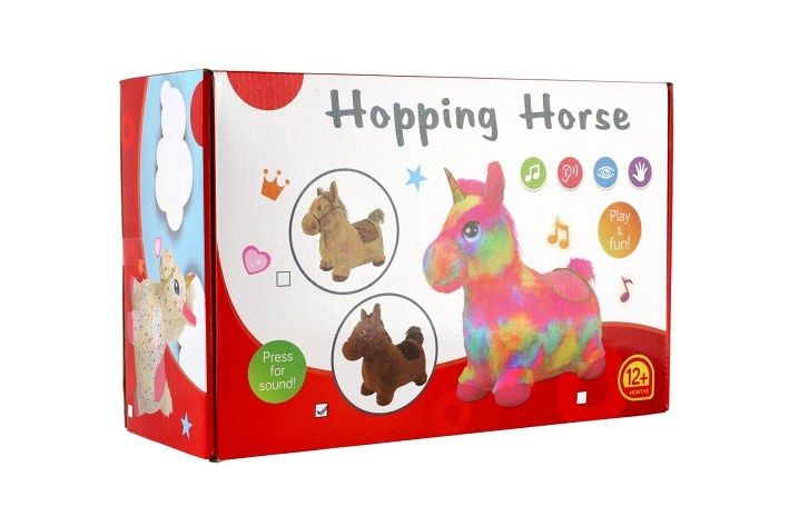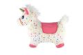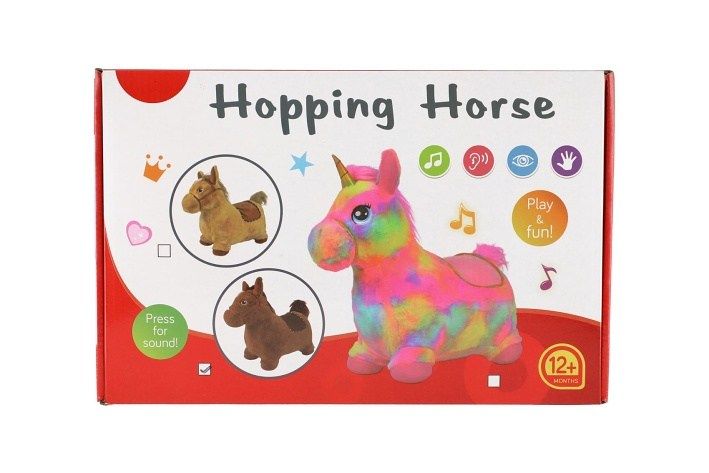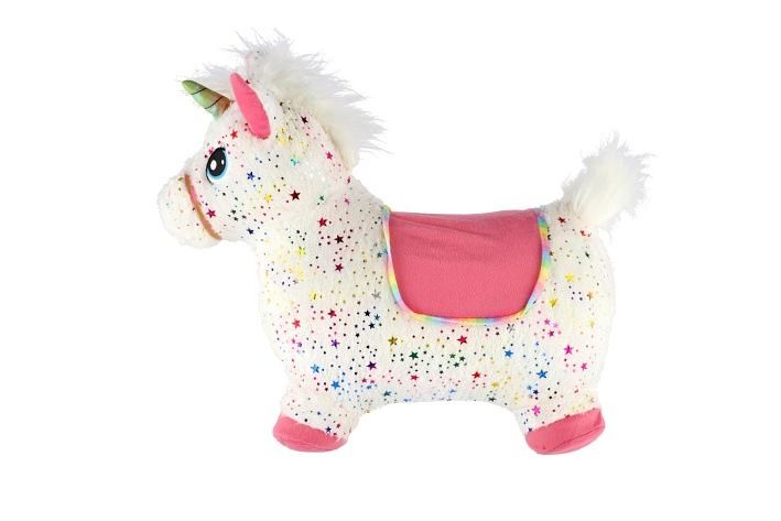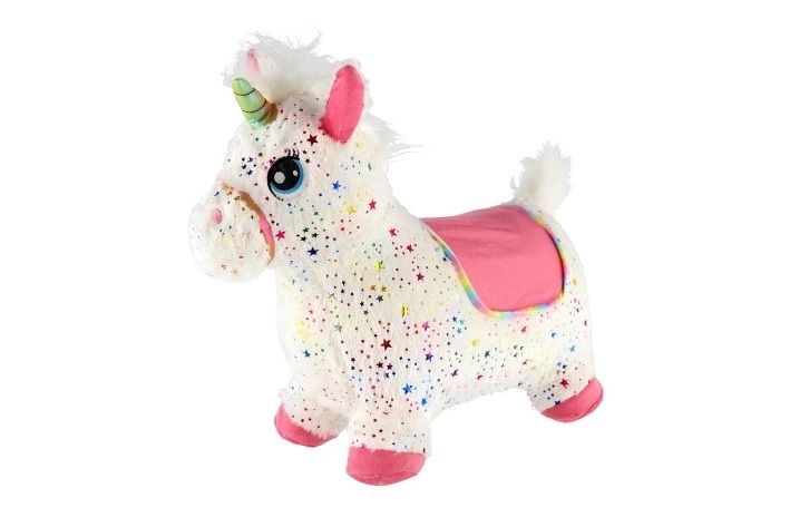 Hopsadlo je velice oblíbená hračka u dětí. Ergonomický tvar pomůže nejmenším při jejich prvních krůčcích. Uši slouží jako držadla. Dítě usedne, chytne zvíře za ouška a může vesele skákat. Vhodné do interiéru i exteriéru - určeno výhradně na jemné a neostré povrchy, jako je tráva, písek, dlažba aj. Jednorožec je vyroben z gumového materiálu a má plyšový potah s barevnými hvězdičkami, který je odnímatelný a pratelný. Jednorožec vydavá zvuky stisknutím tlačítka umístněného na hlavě pod hřívou. Hračka obsahuje baterie 3x LR44, které jsou součástí balení. Balení obsahuje také pumpičku.