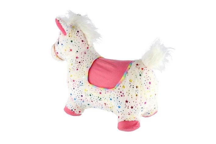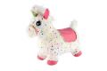 Hopsadlo jednorožec plyš bílý s hvězdičkami výš. sedla 23cm na bat. se zvukem v krab. 35x2