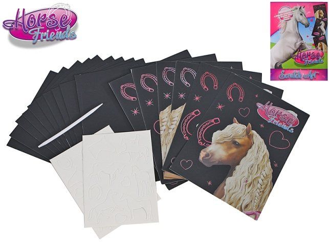 Škrabací papírky patří mezi nejoblíbenější výtvarné hračky. Pomocí přiloženého pera se seškrabuje černý povrch z barevného pozadí. Díky tomu vznikne krásný efekt rytiny. Balení obsahuje 16ks Horse Friends škrabacích papírků.