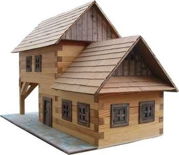 Dřevěná slepovací stavebnice Walachia - Hospoda. Slepovací stavebnice Walachia jsou dřevěné modely domečků a staveb z Valašského kraje v měřítku 1:32. Základem jsou dřevěné hranolky 9x9 mm a k tomu jsou v sadě vždy všechny papírové doplňky - okna, dveře, střešní části atd. Pro lepení se používá lepidlo Herkules, není však součástí stavebnice. Přiložený je montážní návod a malé kapitoly z historie lidové architektury.Níže je označení obtížnosti číslem 1 - 5, přičemž 1 je nejlehčí. Rozměry: 34 x 15 x 23 cm Počet dílů: 192 Obtížnost: 4