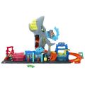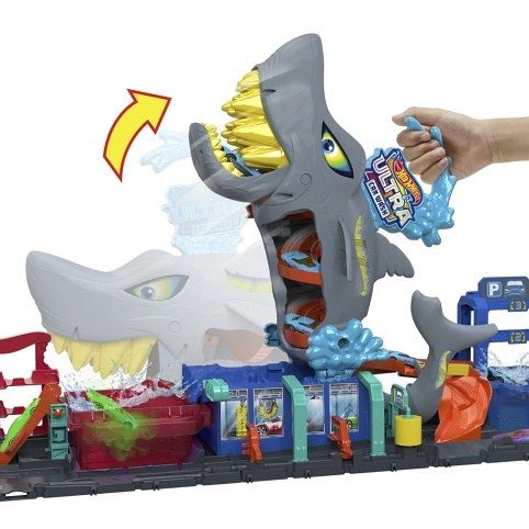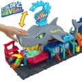 V seriálu Hot Wheels: Závod! na streamovací platformě Netflix ovládl městskou myčku Hot Wheels® obrovský žralok, který se chce vrhnout do akce plné změn barev! Děti přejedou s přibaleným angličákem Color Reveal přes rampu a vjedou do žraločí tlamy, pak stisknou žraločí hlavu, aby změnily barvu vody a odhalily dekor auta. Vytáhněte žraloka a sledujte, jak se auto řítí jeho vnitřnostmi, zatímco přebytečná voda odtéká pryč. Klepnutím na žraločí ocas vypustíte auta z garáže nebo do nádrže s ledově studenou vodou a zažijete překvapení v podobě změny barvy. Set je možné složit na polovinu pro snadné skladování a obsahuje rukojeť, která usnadňuje přenášení. Součástí balení je jeden angličák Hot Wheels® Color Reveal. Barvy a vzhled výrobku se mohou lišit.