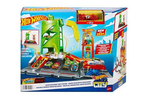 Připravte se na hru na nabité dráze se Super nabíjecí stanicí Hot Wheels City! Tento interaktivní herní set obsahuje polohovatelnou rukojeť pro nabíjení připomínající elektromobil, kterou děti zasunou na určená místa a aktivují tak skvělé detaily, například výměnu značek, výtahy pro auta a odpalovací zařízení. Zaparkujte na stanici 10 angličáků v měřítku 1:64 pro další hru i uskladnění. Jedno autíčko Hot Wheels je součástí balení, další vozidla se prodávají samostatně. Super nabíjecí stanice se připojuje k dalším setům a drahám Hot Wheels, takže si děti mohou sestavit vlastní jedinečnou městskou scenérii pro dobrodružství s volným koncem. Barvy a provedení dekorací se mohou lišit. Věk 4+