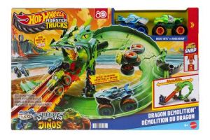 Závod začíná! Hot Wheels Monster Truck se utkávají v epickém souboji žraloci versus dinosauři, aby porazili svého úhlavního nepřítele – kybernetického draka v herním setu Dračí zkáza. Naložte oba přiložené monster trucky do dvojitého odpalovače a vystřelte je současně přímo do dračí tlamy. Čeká je divoká jízda skrz jeho tělo, kde rozhoduje motorová pila jako přeřazovač, který náhodně určí jeden ze tří výsledků – zadrží oba monster trucky, shodí jednoho z trati nebo propustí oba k vítězství. Jakmile drak padne, děti můžou znovu odstartovat útok a získat trofej! Součástí jsou dva monster trucky Hot Wheels v měřítku 1:64. Barvy a vzhled výrobku se mohou lišit. Doporučený věk 4+