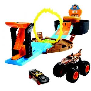 Set Hot Wheels® Monster Trucks Stunt Tire ™ se sklopí pomocí rukojeti pro přenositelnost a otevře se, aby odhalil výstřední kaskadérskou arénu pro bourání, narážení a ukládání. Sestavená sada je dlouhá přes 35 palců a má úžasné funkce. Kultovní nadrozměrná pneumatika pro monster truck obsahuje monster truck Tiger Shark a vozidlo Hot Wheels® v měřítku 1:64. Když se set otevře, odhalí odpalovač buď pro dvě auta, nebo jeden monster truck, aby vzlétly po rampě a proletěly „ohnivým kruhem“. Vozidlo pak musí přistát přímo na platformě, která jej převrátí do kruhu vítězů a ohodnotí jeho výkon, tím dává dětem okamžitou zpětnou vazbu o jejich dovednostech!