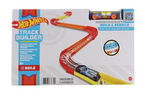 Postavte si dráhu s pořádnými zatáčkami s Hot Wheels® Track Builder setem pro stavitele - zatáčky. Tento set s prémiovými 90stupňovými zatáčkami umožní dětem vytvářet jedinečné dráhy do tvaru S, a díky rovným dráhám o délce 30 cm a 15 cm také oválnou závodní dráhu. Balení obsahuje jeden angličák Hot Wheels®, rovné dráhy, zatáčky a konektory pro vytváření nezapomenutelných drah. Věk 6+