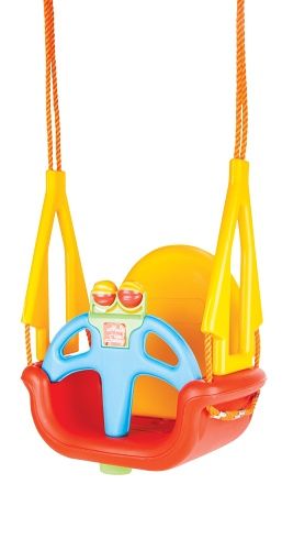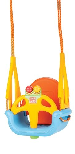 Dětská houpačka se zábranou a chrastítky.Pohodlné opěrátko. Rozměry 33×47×58 cm.Maximální délka provazu 160 cm.Zakončeno karabinkou.