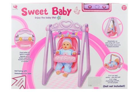 Houpačka pro panenky. Po vložení baterií houpačka vydává zvuky a svítí. Napájení na 2 AG13 baterie (jsou součástí). Houpačku lze sundat a použít jako autosedačku pro panenky. Houpačka je vhodná pro panenku o velikosti cca 45 cm. Panenka není součástí balení. Rozměry houpačky cca 40 x 57 x 34 cm. Rozměry balení cca 53 x 39,5 x 10,5 cm. Věk 3+