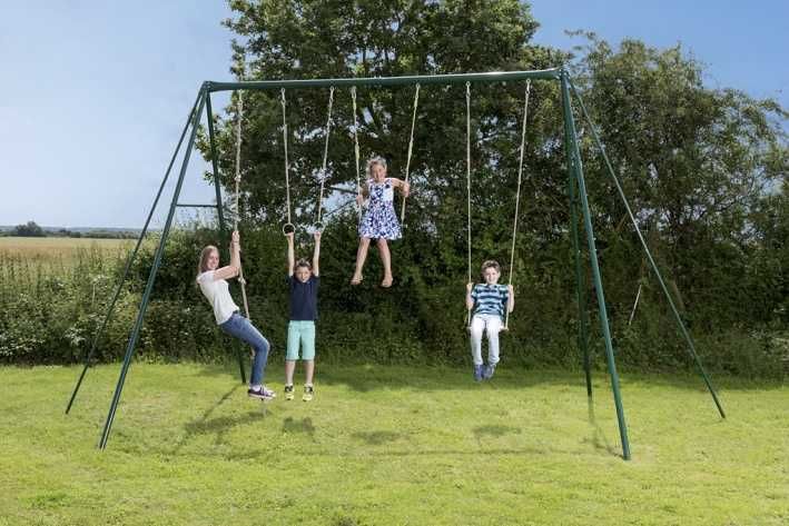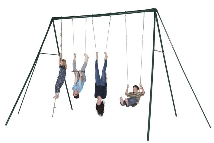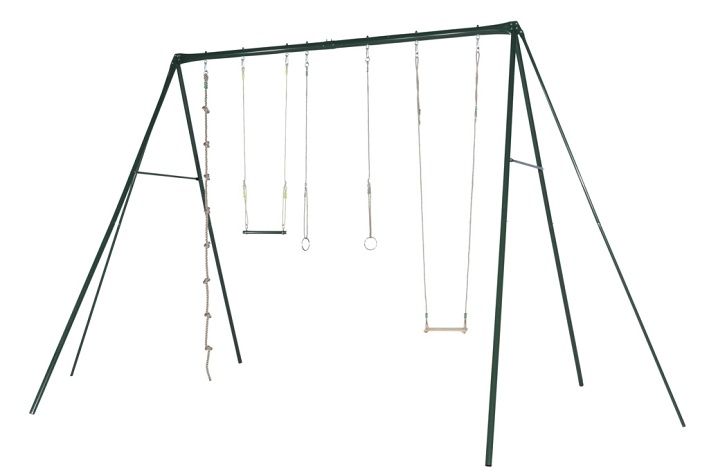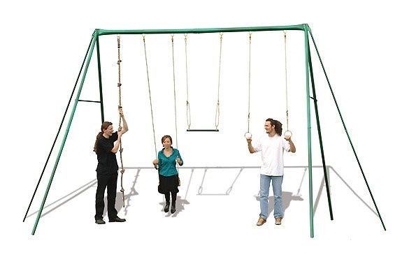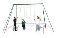 Kovová sestava 350 cm vysoká z 80 mm trubek o šířce výrobku 6 m, což umožňuje zábavu i dospělákům a teenagerům . 1 sedátko+1 kovové kruhy+1 hrazda+1 lano na špl s uzly