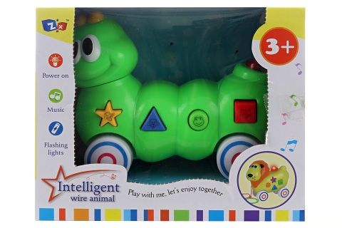 Tahací housenka na baterie (2xAA - nejsou součástí balení). Materiál plast. Po vložení baterií housenka vydává zvuky zvířátek dle obrázků na tlačítkách. Baleno v krabici. Rozměry balení cca 20,5x16,5x9,5 cm. Věk 3+