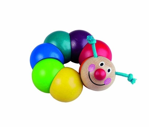 Hračka z barevných dřevěných perlí navlečených na gumě, které se pohybují, točí a ohýbají. Vhodná k procvičování jemné motoriky rukou Vašich dětí již od 6ti měsíců. Výrobek splňuje požadavky EU na bezpečnost hraček. Délka housenky je 13 cm a je připevněna na papírové kartě.