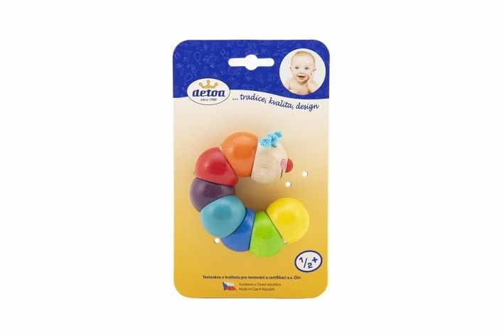 Hračka z barevných dřevěných perlí navlečených na gumě, které se pohybují, točí a ohýbají. Vhodná k procvičování jemné motoriky rukou Vašich dětí již od 6ti měsíců. Výrobek splňuje požadavky EU na bezpečnost hraček. Délka housenky je 13 cm a je připevněna na papírové kartě.