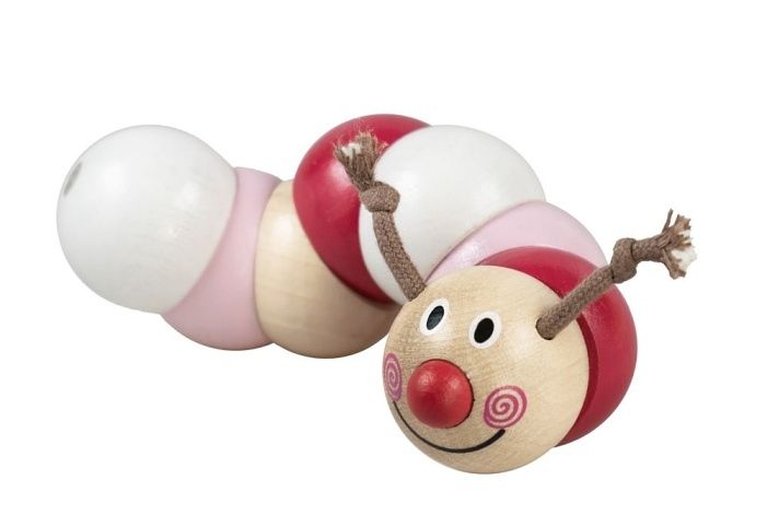 Hračka v podobě housenky z barevných dřevěných perlí navlečených na gumě, které se pohybují, točí a ohýbají.