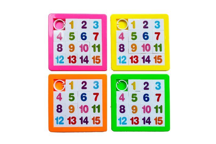 Hra 15, hlavolam logická. Rozměry 12,8x0,6x12,8 cm. 4 barevné varianty