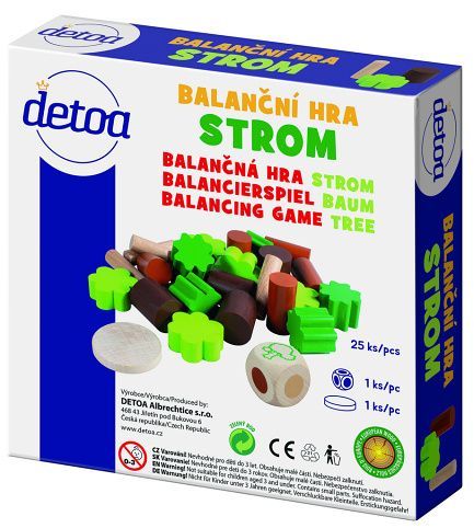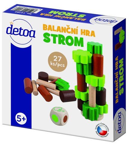 Balanční hra Strom, slouží k rozvoji jemné motoriky rukou. Barva na kostce určuje barvu dílku, který musí hráč umístit na hrací plochu. Hra pokračuje, dokud strom nebude plně postavený nebo se rozpadne jednomu z hráčů pod rukama. Hra je určená pro 1 - 6 hráčů. Rozměry výrobku jsou 152 x 35 x 152 mm.