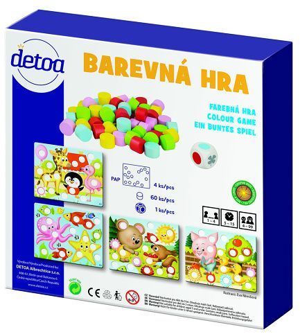 Desková hra pro nejmenší hráče od 4 let a jejich rodiče. Hra pomůže vyplnit dětem a jejich rodičům společně strávené chvíle. Rozvíjí znalost základních barev a motoriku rukou. Výrobek splňuje požadavky EU na bezpečnost hraček a je vhodný pro děti od 4 let. Baleno v papírové krabici o rozměrech 200x200x37 mm. Obsah balení je 60 barevných dřevěných válečků, hrací kostka, 4 herní desky z tvrdého kartonu.