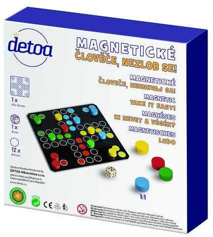 Magnetické Člověče, nezlob se! je známá desková hra pro děti i dospělé. Obsahuje 12 magnetických dřevěných žetonků o průměru 15 mm, hrací kostku o rozměrech 16 mm a herní plán. Baleno v papírové krabici o rozměrech 335x230x35 mm. Výrobek splňuje požadavky EU na bezpečnost hraček a je vhodný pro děti od 3 let.