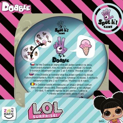 Dětská verze populární hry Dobble na motivy oblíbených postaviček L.O.L. Rychlost, postřeh, reflexy! Dobble L.O.L to je 30 různých obrázků, 30 karet, 6 obrázků na kartě a každé dvě karty spolu mají společné jen jeden obrázek! Hra je kompletně v češtině i slovenštině a nabízí zcela unikátní zábavu. Děti zde hledají dva stejné obrázky na kartách při různých verzích hry (v pravidlech je popsáno celkem 5 her). Super jsou kulaté karty i jednoduchá pravidla vysvětlená doslova za pár sekund. Cílová skupina jsou hlavně děti ale i rodiče - všichni, kdo se chtějí pořádně bavit a nemají čas pročítat dlouhá pravidla. Plechová krabička zaručuje bezpečí karet a je i další přidanou hodnotou. Vyzkoušejte i Vy hru Dobble L.O.L. a budete nadšení, jak i tak jednoduchá hra může být zábavná!