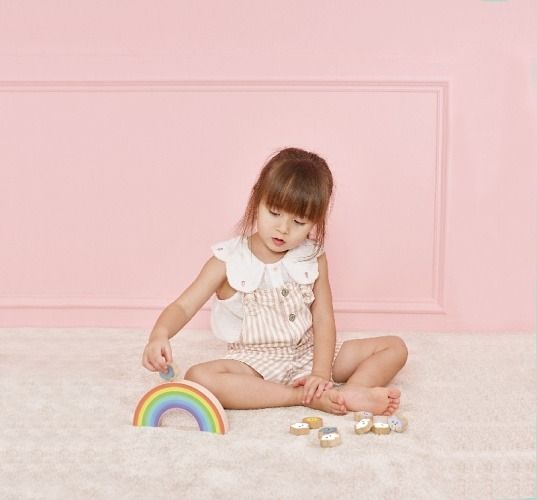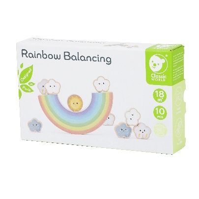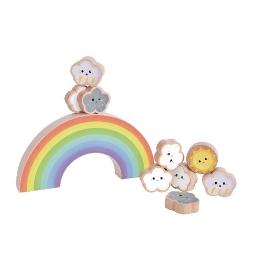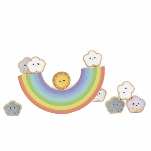 Duha o sedmi barvách je jako nádherný barevný most. Živé mraky znázorňují různé druhy počasí, 1 roztomilé slunce, 4 mraky, 2 deštivé mraky a 2 hromové mraky. Když se duha převrátí, děti si na ni mohou libovolně naskládat mraky a získat znalosti o počasí v radostné balanční hře. Tato hra může také zlepšit schopnost koncentrace a koordinaci ruka-oko