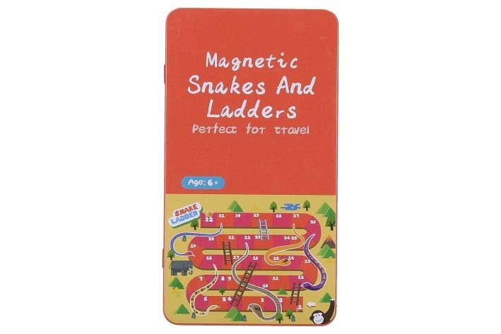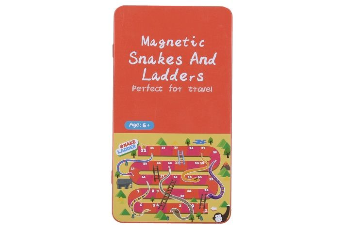 Hra hadi a žebříky magnetická cestovní. Rozměry pouzdra 10x18,5 cm. Plechové pouzdro slouží po otevření jako hrací deska. Figurky jsou magnetické. Součástí hrací kostka.