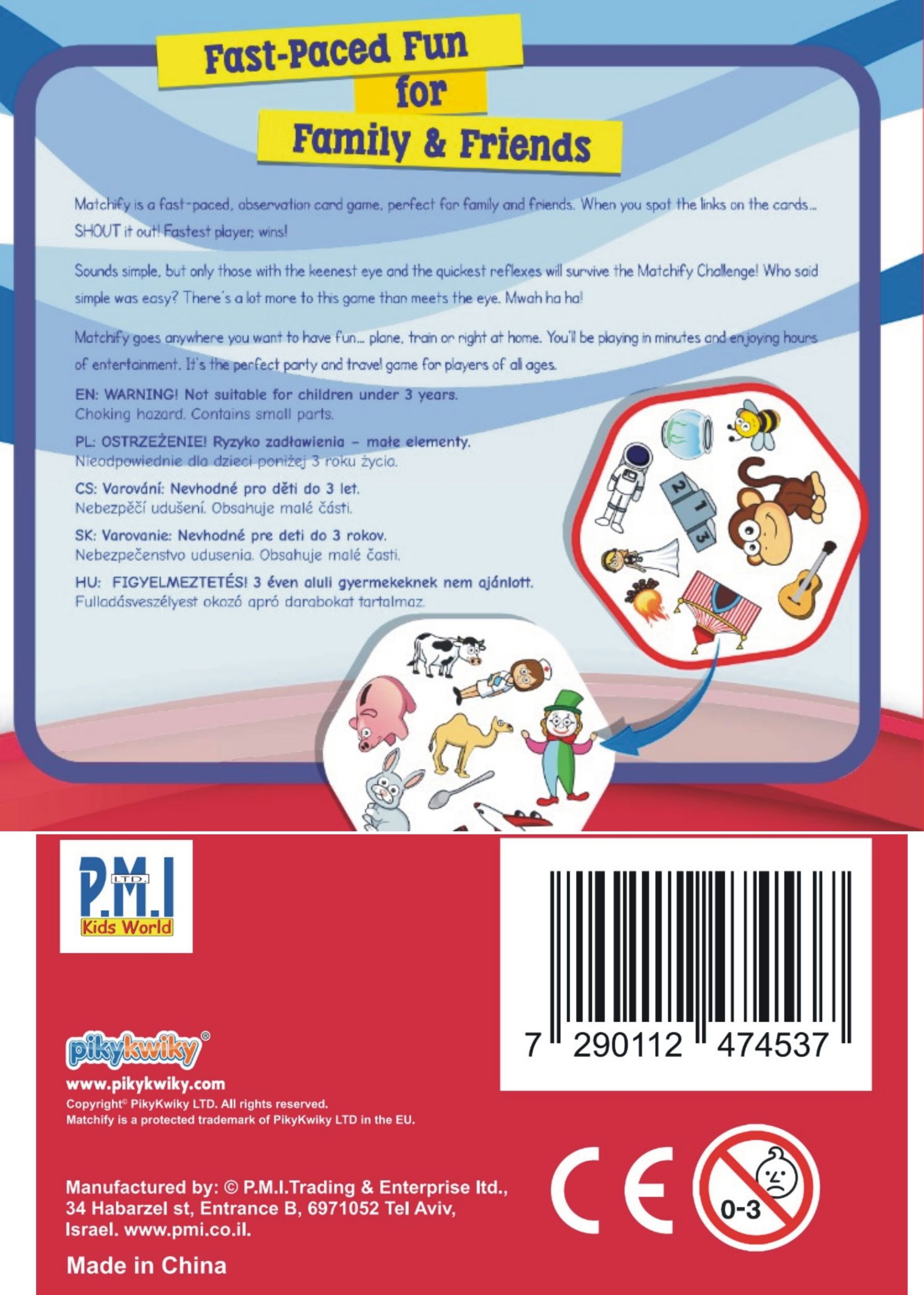 Matchify je rychlá, dynamická společenská hra pro celou rodinu, při které trénujete postřeh, pozornost a rychlost. Cílem hry je co nejrychleji najít spojení mezi dvěma kartami a jako první toto spojení vyslovit.