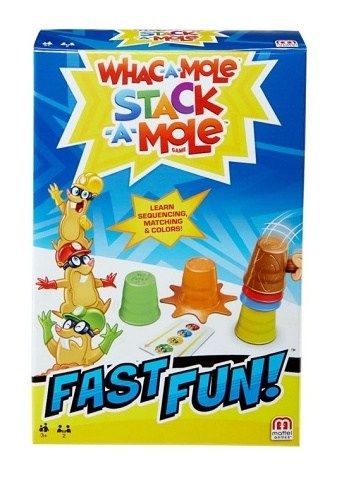 Hra Mattel Whack a Mole Stack a Mole Fast Fun (sejmi krtka), 16x24 cm, rychlá hra pro 2 hráče je kratší a jednodušší verzí původní hry Whac-a-Mole™. Hra obsahuje skládací paličku a barevné kelímky. Chcete-li hrát, otočte kartu a pomocí paličky sladěte barvy na kartě s barevnými kelímky pro krtky. Do kelímků "narazíte" paličkou, abyste je naskládali v pořadí jako na kartičce. Ale pospěšte si – váš soupeř se snaží naskládat ty jejich jako první! Buďte první, kdo naskládá všechny kelímky ve správném pořadí a vyhráváte! Hra rovněž pomáhá trénovat postřeh, rozpoznávání barev a jejich správné seřazování podle předlohy. Balení obsahuje 2 kladívka/paličky, 8 pohárků s krtkem, 1 falešný pohárek, 10 karet se zadáním