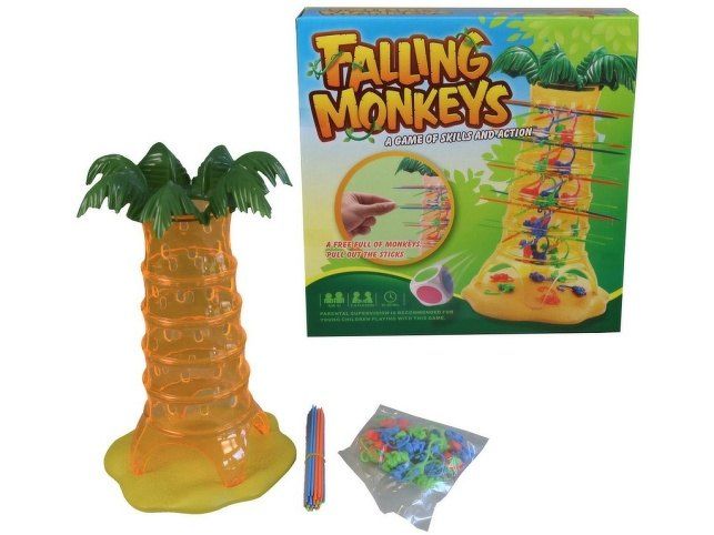 Hra - opičky 26 x 26 cm. Hra padající opičky pro 2 - 3 hráče. Sada obsahuje opičky, tyčinky, základnu - palmu, kmeny, korunu, hrací kostky. Hráči se postupně snaží vysouvat tyčinky tak, aby žádná opička nespadla.