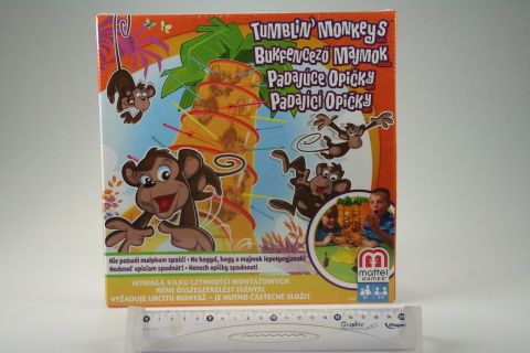 Hra plná zábavy obsahuje 1 strom, 30 opiček, 30 tyček ve 3 barvách, 1 kostku. ... hoďte kostkou a opatrně vytáhněte tyčku odpovídající barvy ze stromu. Spadla nějaká opička ? Špatně !!! Čím méně opiček máte, tím lépe. Doporučený věk 5 let +