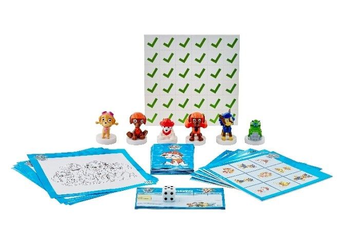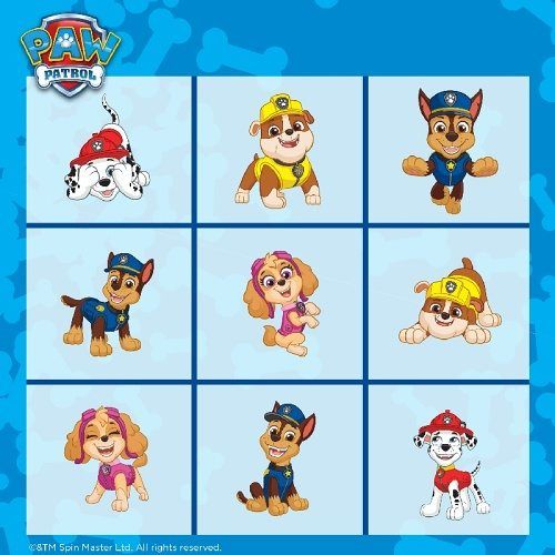 Hra se hraje na destičce složené z mřížky 3x3 čtverce. Uvnitř každého čtverce je jeden obrázek PAW Patrol. Na začátku hry si každý hráč vezme jednu destičku s 9 čtverci. Vytvořte balíček z karet s obrázky PAW Patrol tak, aby obrázky byly lícem dolů. Jeden z hráčů vezme kartu z vrchu balíčku. Poté ukáže ostatním obrázek PAW Patrol, který je na kartě. Pokud má některý z hráčů tento obrázek na své destičce, vezme si žeton zelené fajfky a položí ho na daný čtverec na destičce. První hráč, který pokryje žetony zelené fajfky všechny čtverce na své destičce, je vítězem. Tento vítěz otiskne své razítko PAW Patrol do výsledkové tabulky. Hráč, který během pěti kol bude mít nejvíce výher, se stává vítězem turnaje a otiskne své razítko PAW Patrol do části výsledkové tabulky určené pro Razítko šampiona turnaje. Přejeme hodně zábavy! Každá hra obsahuje 6 různých druhů figurek. Nelze vybrat konkrétní druhy!