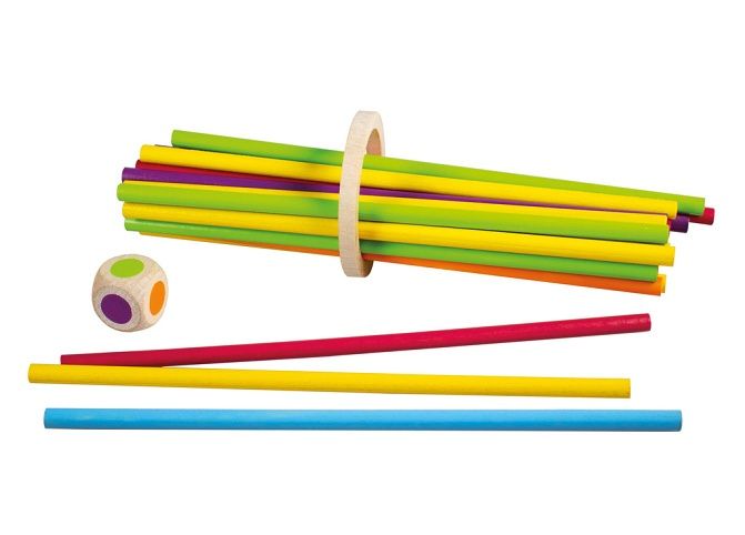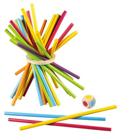 Chcete si zahrát mikádo trochu jinak? Tyčkohraní je hra na procvičení barev a jemné motoriky. Hoďte kostkou a vytáhněte tyčku stejné barvy tak, aby se dřevěné kolečko nedotklo stolu. Obsah balení je 30 ks barevných tyček, 1 hrací kostka, 1 dřevěný kroužek. Varování: nevhodné pro děti do 3 let. Obsahuje malé části. Nebezpečí zalknutí.