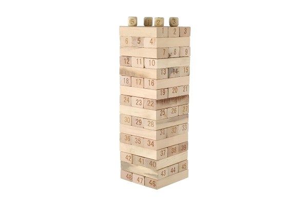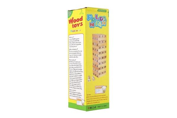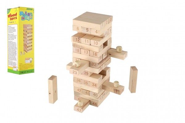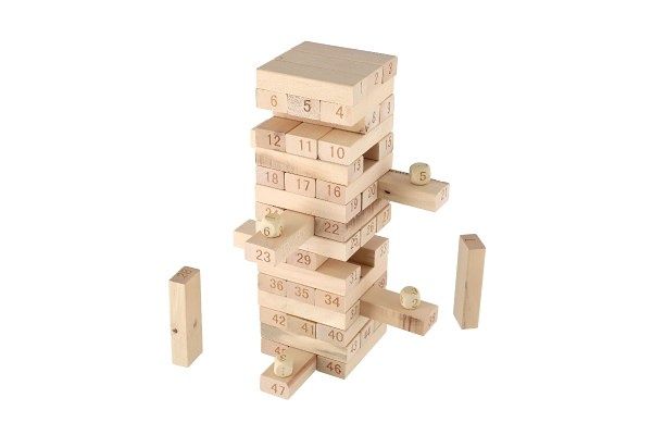 Zábavná hra s bloky ze dřeva. Výtáhněte bloky a umístěte je na sebe - v každém patře budou vedle sebe 3 bloky, návzájem kolmo umístěné. Vznikne tak věž, kterou ale nesmíte shodit! Jak na samotnou hru? Každý hráč postupně odeberu jednu cihlu, odkudkoli a musí jí přemístit na vrchol věže. Ten, kterému spadne věž při jeho tahu, prohrává. Dalším způsobem, jak si hru ztížit je, že použijete kostky v balení. Hodíte si tak číslo bloku, který budete muset vytáhnout... A to už není tak lehké! Užijete si spoustu zábavy.