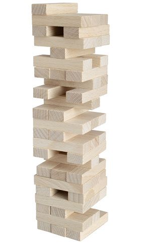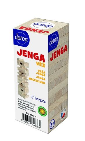 Hra Jenga pro dva a více hráčů podporující motorickou zručnost a trpělivost. Obsah balení je 51 ks dřevěných hranolků 8x14x45 mm. Varování: nevhodné pro děti do 3 let. Obsahuje malé části. Nebezpečí zalknutí.