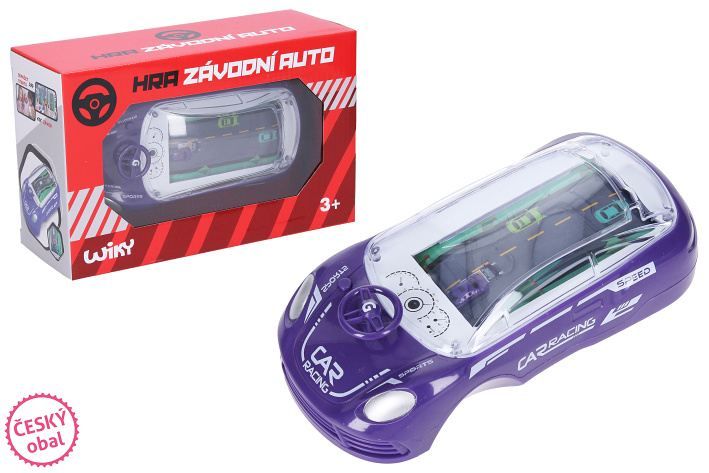 Hra závodní auto fialová. Rozměry 17x8x5 cm. Světelné a zvukové efekty. 3xAAA baterie nejsou součástí. Ovládání volantem. Aktivace tlačítkem vlevo od volantu. Cílem hry je vyhýbat se autům na silnici.