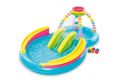 Skvělé hrací centrum v duhovém designu, se kterým si v horkých letních dnech užiješ spoustu zábavy a osvěžení. Hrací centrum se skluzavkou, sprškou a 6ti míčky v balení. Extra polstrování, vypouštěcí ventil v podlaze. Vyrobeno z testovaného masivního vinylu. Přibližná velikost 295×191×109 cm. Opravná záplata přiložena.