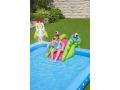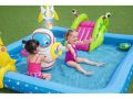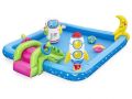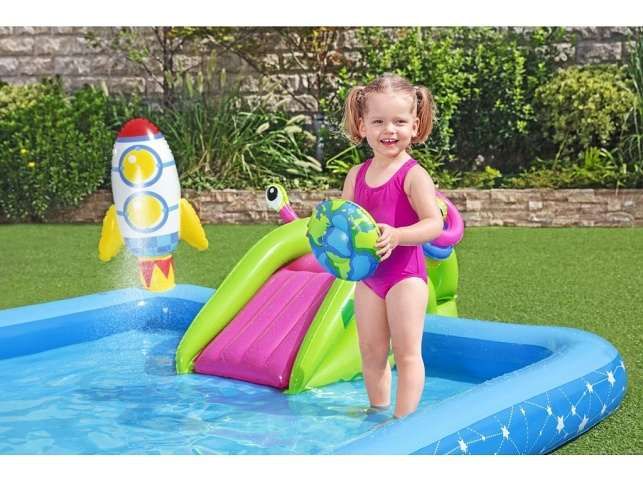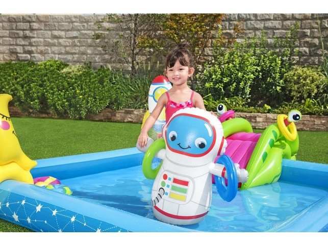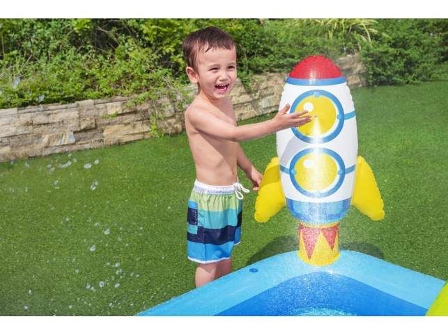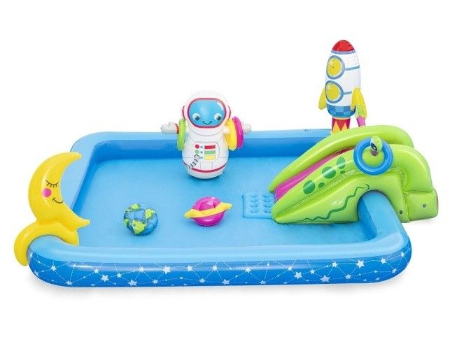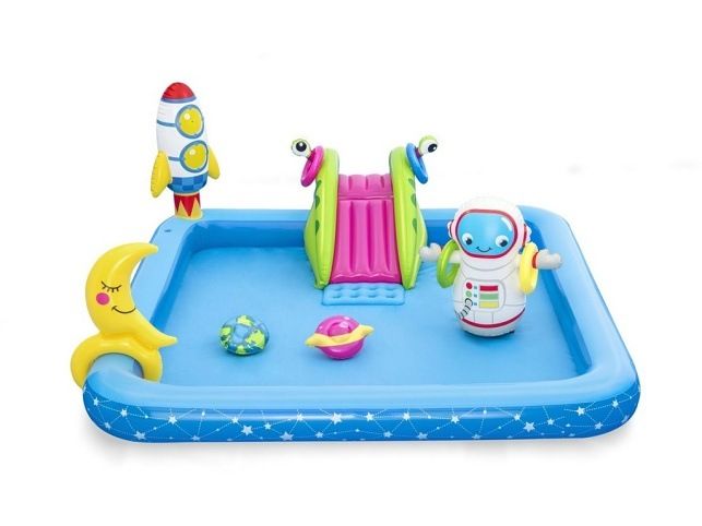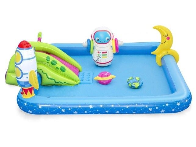 Krásné vesmírné nafukovací hrací centrum s kosmickými motivy. Balení obsahuje bazének se skluzavkou, nafukovacím kosmonautem, raketou, měsícem, kroužky Bazének nabízí možnost zábavy jako je házení kroužků a odnímatelnou skluzavku. Po ukončení vodních radovánek snadno vypustíte vodu z bazénku pomocí vypouštěcího ventilu. Balení obsahuje opravnou sadu. Bazének je o rozměru 228 x 206 x 84 cm. Hračka je určena pro děti 2 +. Materiál hračky je vinyl. Objem vody: 308 l Kosmická loď s vestavěným jemným chladivým rozprašovačem mlhy. Skluzavka je připevněna ke dnu bazénu a končí měkkou dojezdovou podložkou. Údery, rány a kopy bez omezení. Měsíc slouží jak terč k házení čtyř kroužků. Obsah: 1 bazének, 1 boxovací figura, 1 měsíc na házení kroužků, 1 frisbee (Země), 1 frisbee (planeta), čtyři kroužky, záplata pro opravy.