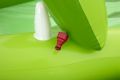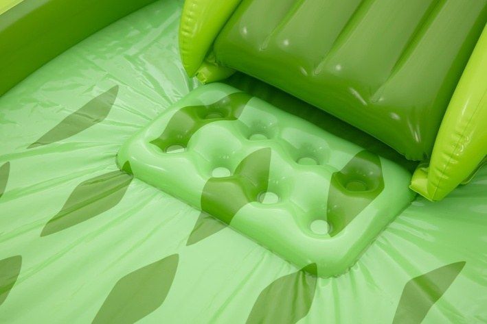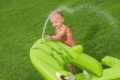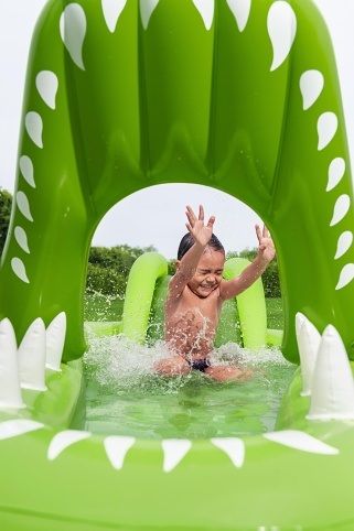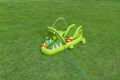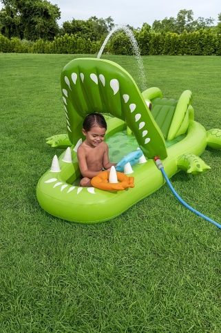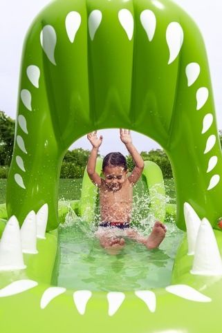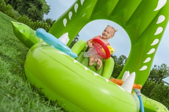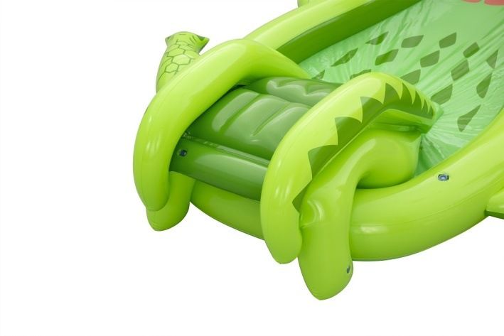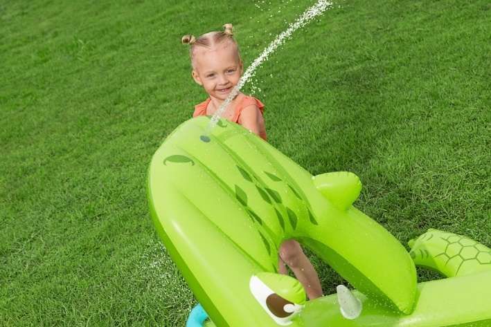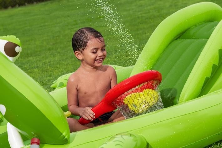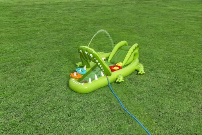 Nafukovací hrací centrum ve tvaru aligátora představuje ideální letní zábavu pro malé děti. Celková velikost této hry je 234 cm na délku, 163 cm na šířku a 87 cm na výšku, což zaručuje dostatek prostoru pro několik dětí k hraní i vodním radovánkám. Hrací centrum je vyrobeno z kvalitního a odolného vinylu, který zajišťuje dlouhou životnost a snadnou údržbu. Jeho kompaktní rozměry umožňují snadné umístění na zahradu či terasu. Design aligátora je velmi realistický a poutavý, přičemž nafukovací tlamu tvoří brána, přes kterou děti mohou prolézat nebo sjíždět skluzavkou. Skluzavka má měkkou přistávací dráhu, která zvyšuje bezpečnost při hře. Na horní straně hlavy aligátora je zabudován rozstřikovač vody připojitelný k zahradní hadici, který stříká vodu směrem ke skluzavce, čímž přidává další rozměr zábavy a osvěžení v horkých dnech. Vodní plocha hracího centra pojme až 152 litrů vody, což umožňuje příjemné brouzdání. Součástí hracího centra jsou také doplňky pro interaktivní hru – dvě plastové rybičky, dva nafukovací rybí kroužky a podběrák, které podporují dovednostní hry, například házení kroužků na zuby aligátora. Celý bazén je navržen tak, aby děti mohly zkoumat, chytat rybičky a užívat si vodních aktivit. Pro případ drobných poškození je v balení také záplata na opravy. Díky jasně zelenému barevnému provedení s výraznými detaily na kůži aligátora a realistickými bílými zuby je hra vizuálně atraktivní a dobře rozpoznatelná. Nafukovací hrací centrum se snadno nafukuje a vypouští díky několika ventilům rozmístěným po celém těle aligátora. Je určeno pro děti od 2 let a přináší bezpečnou a zábavnou variantu vodních her na zahradě, která rozvíjí motorické dovednosti a nabízí mnoho hodin aktivní zábavy na čerstvém vzduchu.