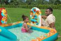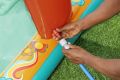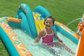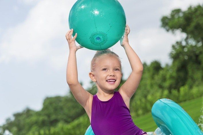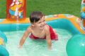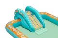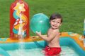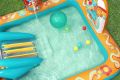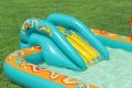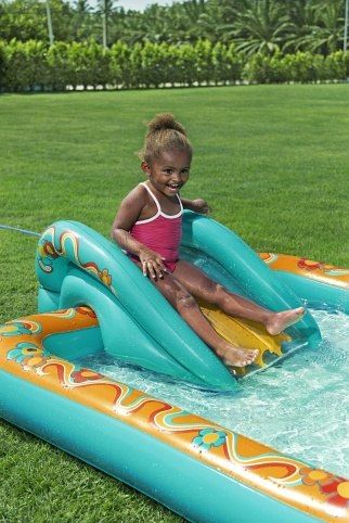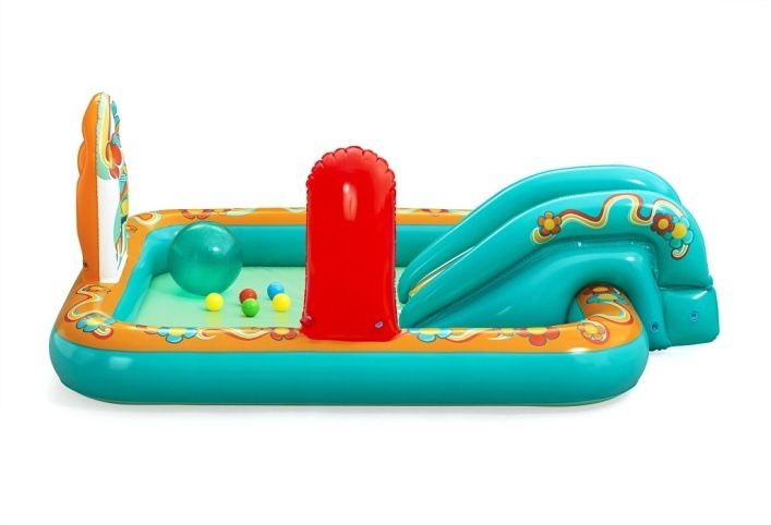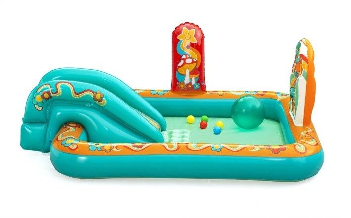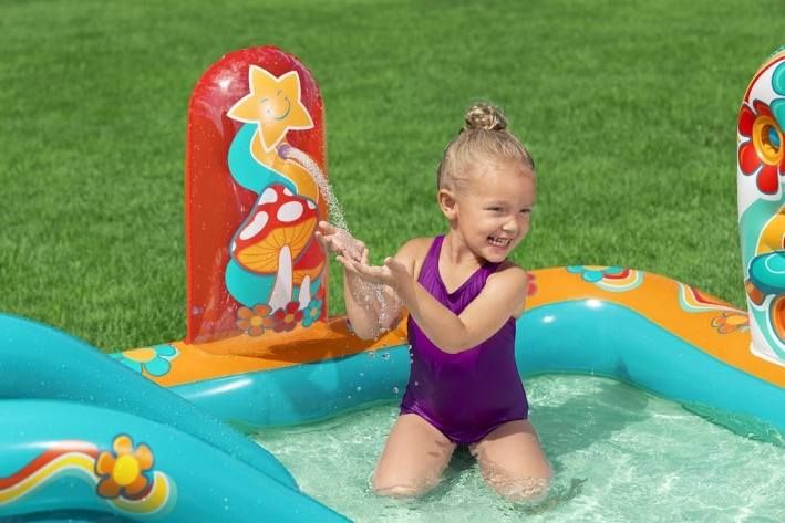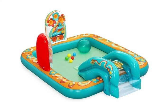 Hrací centrum nafukovací Retro o rozměrech 193 × 152 × 74 cm představuje multifunkční dětský bazén, který nabízí zábavu i osvěžení během teplých letních dní. Je vyrobený z odolného vinylového materiálu, který zajišťuje dlouhou životnost a bezpečné používání. Bazén je barevně laděný v retro stylu s výraznými oranžovými, tyrkysovými a zelenými odstíny doplněnými květinovými a vlnkovými motivy, které přitahují pozornost a vytváří hravé prostředí pro děti. Součástí tohoto hracího centra je nafukovací skluzavka s podporou po stranách, která končí přímo v bazénu, což dětem umožňuje bezpečný a zábavný skluz do vody. Skluzavka je provedena v tyrkysové a žluté barvě s podobnými květinovými detaily jako zbytek bazénu. Bazén obsahuje také dvě nafukovací panely, z nichž jeden je opatřený motivem kolečkových bruslí s otvory pro třídění barevných míčků, což podporuje rozvoj motoriky a zábavné hry ve vodě. Druhý panel slouží jako rozstřikovač vody, který se připojuje k zahradní hadici a zajišťuje příjemné osvěžení stříkající vodou, která vytváří dynamické a interaktivní prostředí. Uvnitř bazénu najdete celkem šest barevných míčků a jeden větší plážový míč, které zvyšují atraktivitu herního prostoru a stimulují rozmanité herní aktivity. Dno bazénu je nafukovací, což zvyšuje pohodlí a bezpečnost při hraní. Vypouštěcí ventil umožňuje snadné vypuštění vody po skončení používání, což usnadňuje úklid a údržbu. Hrací centrum je určeno pro děti od dvou let a díky svým kompaktním rozměrům je vhodné pro umístění na zahradu nebo terasu. Tento produkt je kompletně vybaven nejen pro zábavu, ale i pro bezpečné a pohodlné použití.