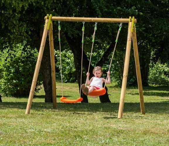 CHERRY – celoDŘEVĚNÉ sestavy 190 cm vysoké, materiál harmonizuje se okolní zahradou.Nastavitelná výška plastového sedátka – 2 ks, vyrobené vstřikovací metodou, houpačka zavěšena na pevném závěsném oku. Spoje jsou kovové !
