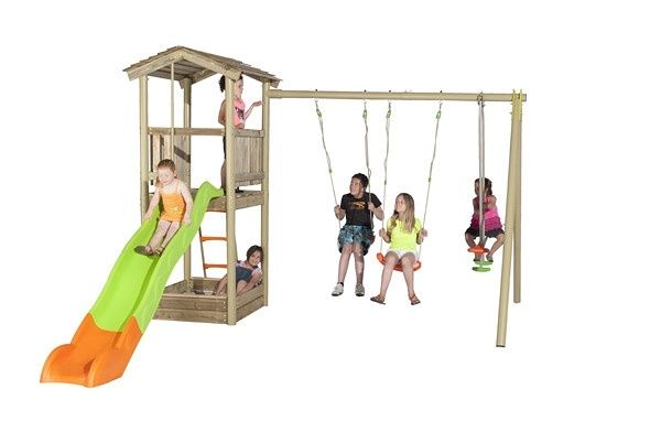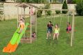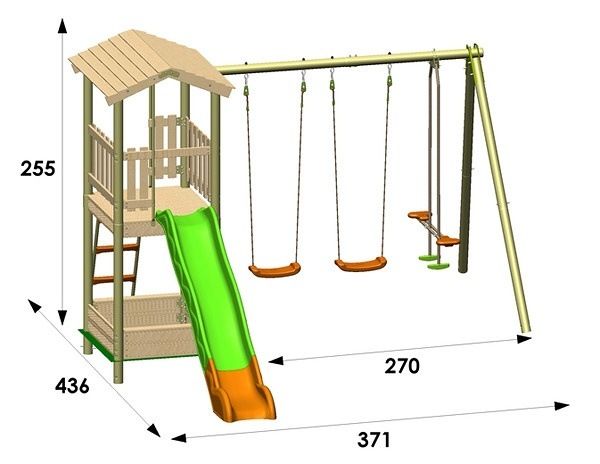 Dominantní kovová věž se stříškou vysoká 250 cm s plošinkou ve výši 120 cm a klouzačkou dlouhou 260 cm, pod věží možnost zbudování pískoviště, 371 cm široká sestava-2 sedátka+1houpací kluzák+klouzačka 230cm dlouhá s nástupní plošinkou ve výši 120cm,