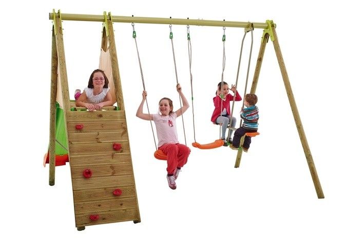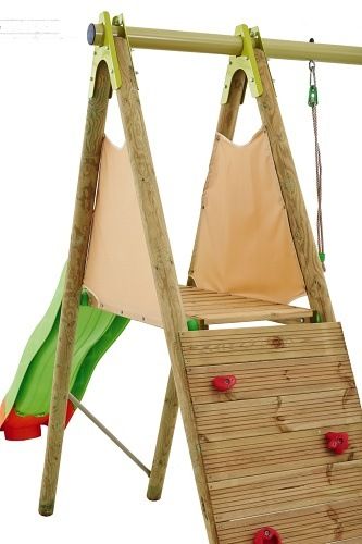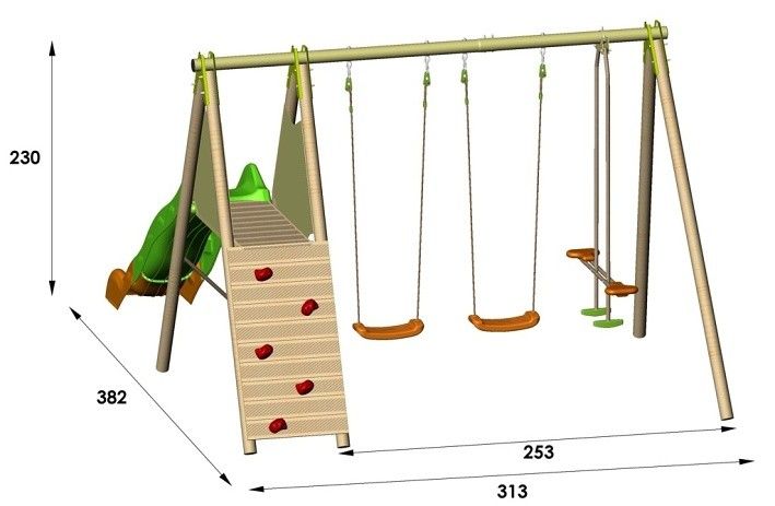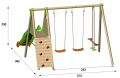 230cm široká sestava-2 sedátka+1houpací sáně+klouzačka 230cm dlouhá s nástupní plošinkou ve výši 120cm s dětskou horelezeckou stěnou, kombinace kovové vrchní tyče s dřevěnými stojnami .