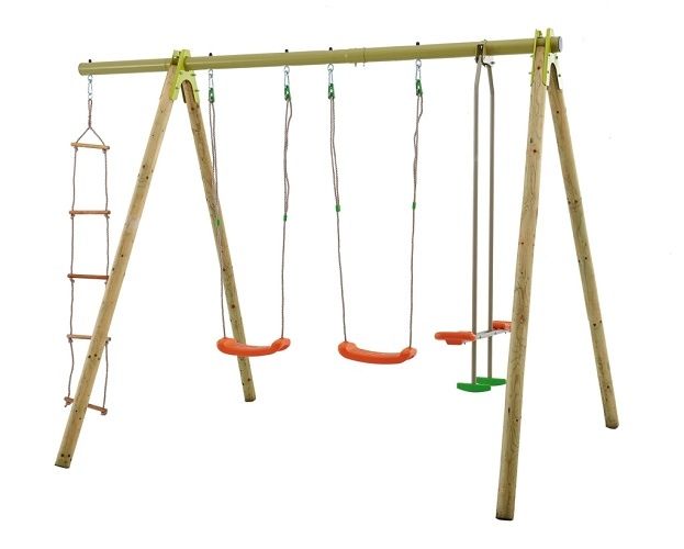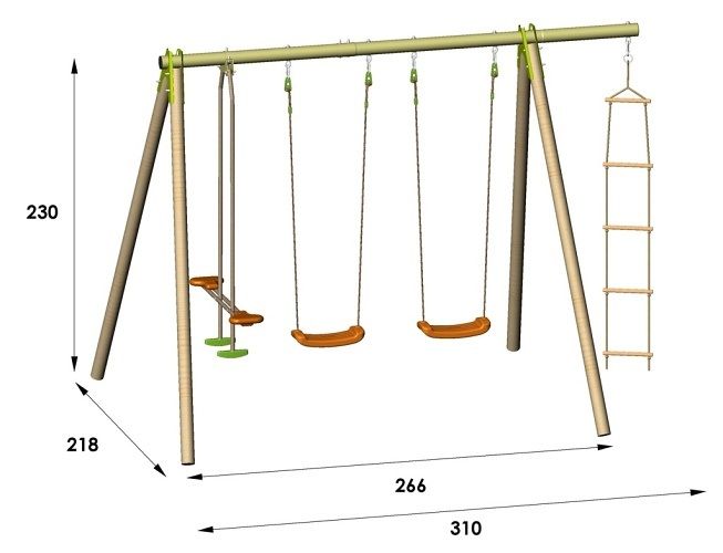 Dřevěná sestava vysoká 230cm s vrchní kovovou tyčí,2 plastová sedátka a houpací sáně s provazovým žebříkem,doporučená maximální váha na houpací sedátko je 50kg a maximální váha na houpací sáně je 50kg na dítě na každé straně.
