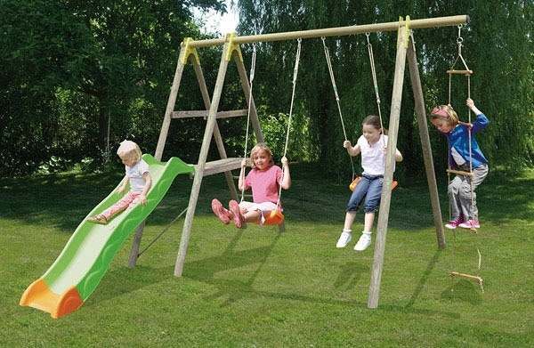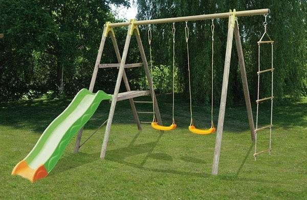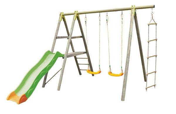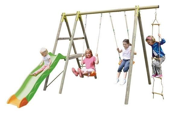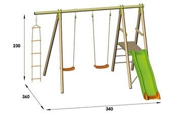 230cm široká sestava-2 sedátka+1 provazový žebřík+klouzačka s nástupní plošinkou, kombinace kovové vrchní tyče s dřevěnými stojnami – lepší integrace do venkovní zahrady