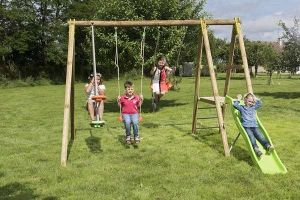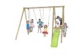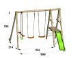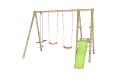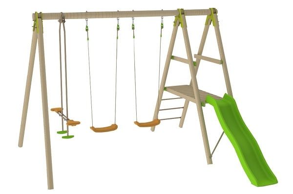 „TUTTI – celoDŘEVĚNÉ sestavy 230 cm vysoké, materiál harmonizuje se okolní zahradou.Nastavitelná výška plastového sedátka, vyrobené vstřikovací metodou Houpací kluzák s plastovými sedáky a trnoží-držák na nohy, skluzavka s nástupní plošinou Houpačka zavěšena na pevném závěsném oku. Spoje jsou kovové !“